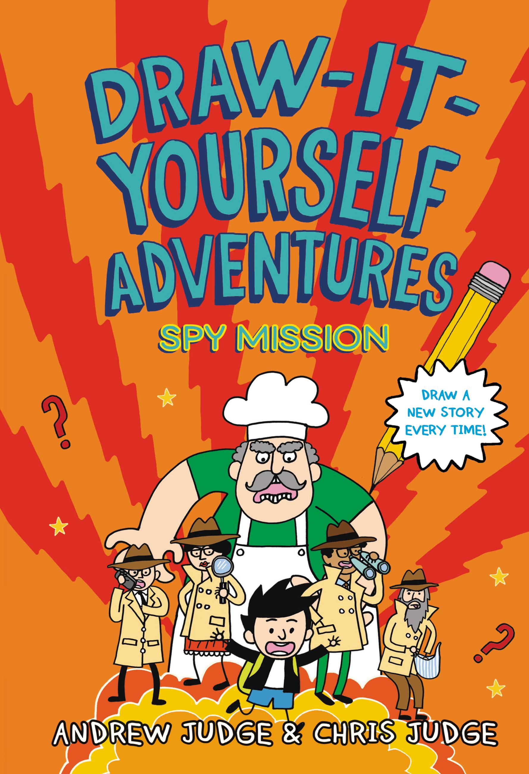 First, assemble your spy kit! Draw yourself goggles and a fake mustache. Now trick out your spy bike with a rocket booster, lasers, and wings! WAIT! Which door did the suspect go through? Each one takes you to a different page….